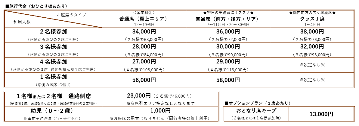 ■当日は旅行会社スタッフ、テレビその他メディアの撮影が行われる場合があります。予めご了承の上お申し込みください。撮影した映像(お客様の容姿を確認できる映像が含まれる場合があります)をWEB掲載・テレビ放送等で使用する場合がございます。旅行のお申込をもって、映像の使用についての許可を得たものといたします(個別にインタビューを行う場合は確認いたします)。