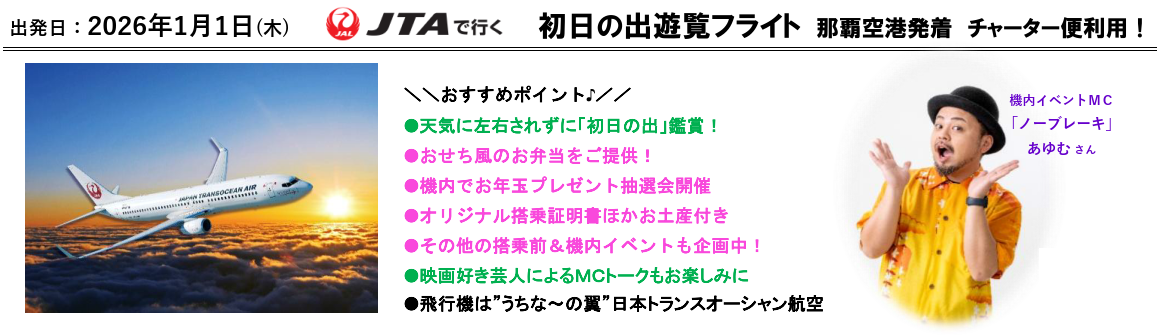 | 運送機関の種類または名称 | 日本トランスオーシャン航空(JTA) | お食事 | 朝食1回(弁当) |