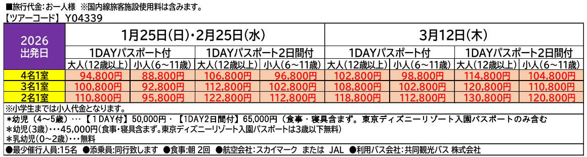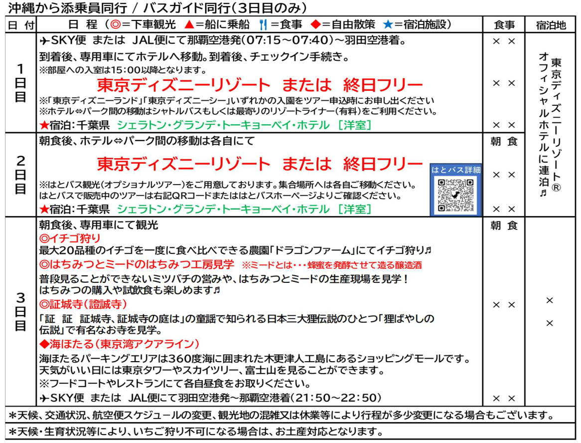 | 運送機関の種類または名称 | スカイマーク(SKY)又は日本航空(JAL)/共同観光バス株式会社 | お食事 | 朝2回 |