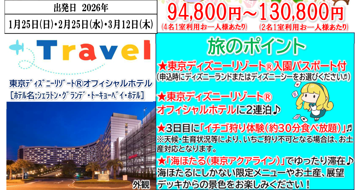 ※パスポート回数は選べるので、1日はディズニーリゾート、残り1日は「はとバス」オプションにご参加いただいたり、ご希望で終日フリータイムにすることも可能です。