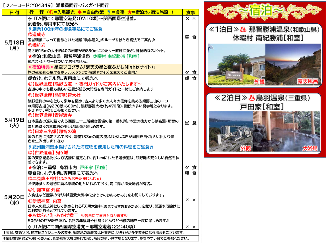 | 運送機関の種類または名称 | 日本トランスオーシャン航空(JTA)/【1・2月】龍神自動車株式会社【5月】関西中央交通または明星観光バス | お食事 | 朝2回/昼2回/夕2回 |
