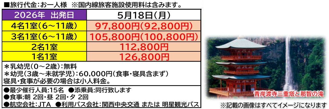 | 旅行日数 | 2泊3日 | 最少催行人数 | 15名 |