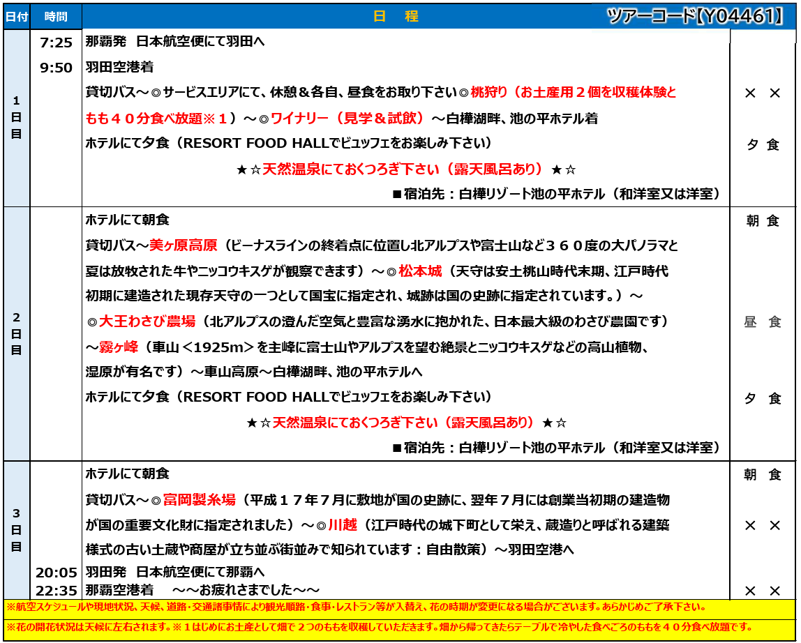 日程表 【添乗員同行】長野・絶景ドライブルート 霧ヶ峰・美ケ原高原と松本城3日間~ 那覇発【遊タイムツアー】