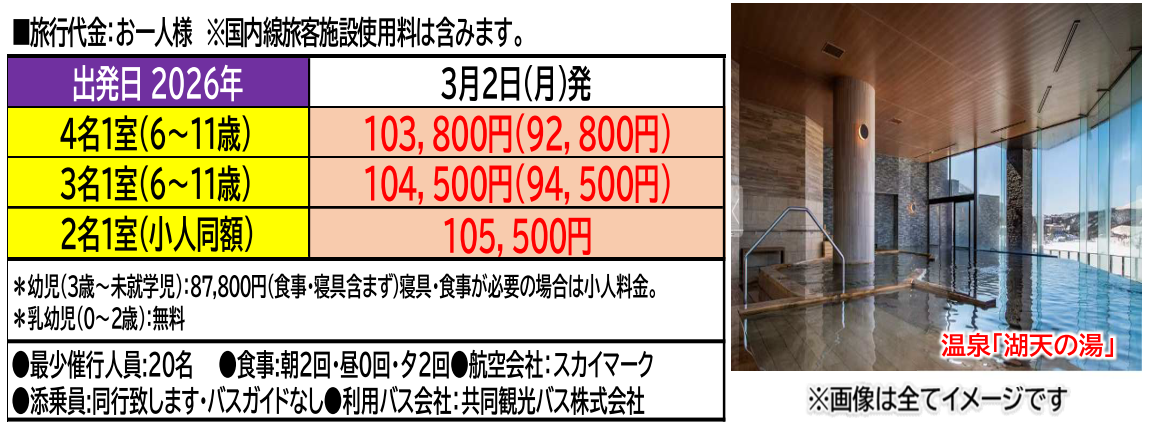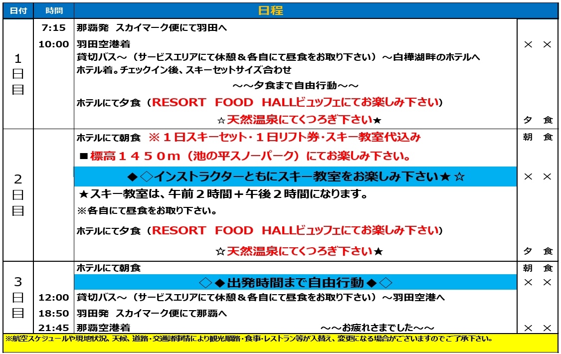 | 運送機関の種類または名称 | スカイマーク(SKY)/共同観光バス | お食事 | 朝2回/昼0回/夕2回 |