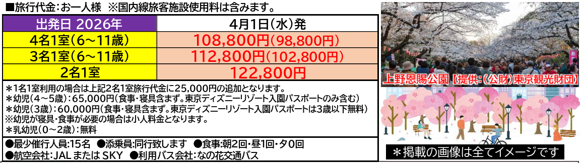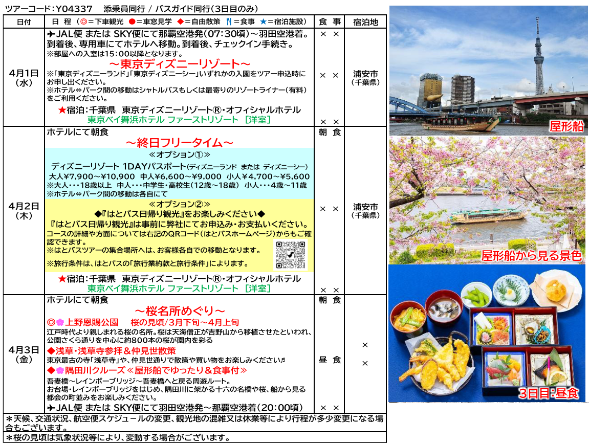 | 運送機関の種類または名称 | スカイマーク(SKY)又は日本航空(JAL)/なの花交通バス | お食事 | 朝2回、昼1回、夕0回 |