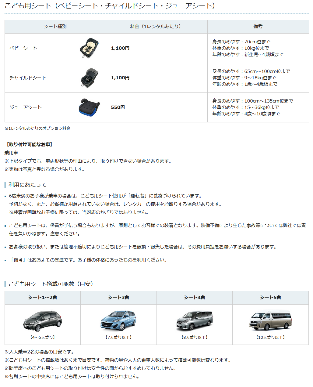 該当するお子様がいらっしゃる場合は、必ずご予約ください。尚車種によっては装着できない場合もありますのでご予約時にご確認下さい。ご予約がなく、また、お客様がご用意されていない場合は、レンタカーの使用をお断りする場合がございます。